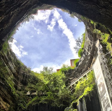 Après une descente en ascenseur ou à pied, l’exploration se poursuit en barque, offrant une traversée magique sur les eaux calmes du gouffre.